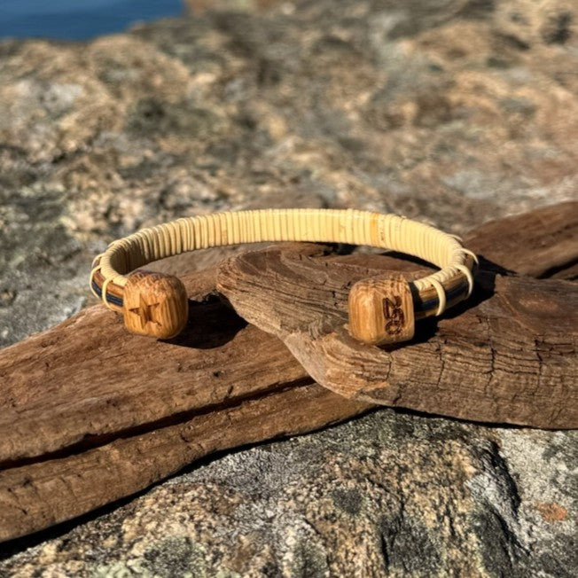 Sleek and timeless, this ¼" cuff bracelet features white oak, the national wood of the United States, and hand-dyed bamboo woven together with intention. It is a modern interpretation of classic Americana — wearable proof that simplicity and spirit can go hand in hand. Beautifully styled to stack with other bracelets or cuffs, or to wear solo.